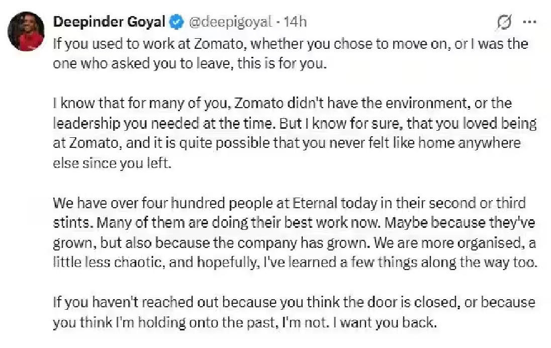 જ્યારે કોઈ કંપની કર્મચારીઓને છૂટા કરે છે, કારણો ગમે તે હોય, ત્યારે ભૂતપૂર્વ કર્મચારીઓ સાથે ભાવનાત્મક જોડાણ ઘણીવાર રહે છે. Eternal (અગાઉ Zomato) ના સ્થાપક અને વાઇસ ચેરમેન, દીપિન્દર ગોયલે સોશિયલ મીડિયા પ્લેટફોર્મ X પર એક ભાવનાત્મક પોસ્ટ શેર કરી, જે આ જોડાણને પ્રકાશિત કરે છે. આ પોસ્ટમાં, તેમણે કંપનીના ભૂતપૂર્વ કર્મચારીઓને પાછા ફરવાનું ખુલ્લું આમંત્રણ આપ્યું.