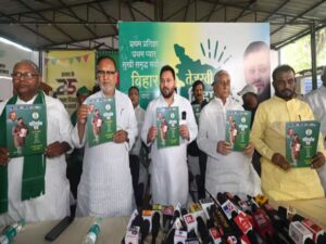 RJD : લોકસભા ચૂંટણી 2024: RJD નેતા તેજસ્વી યાદવે લોકસભા ચૂંટણીને ધ્યાનમાં રાખીને તેમની પાર્ટીનો ઢંઢેરો બહાર પાડ્યો છે, જેમાં તેમણે તેનું નામ પરિવર્તન પત્ર રાખ્યું છે. જેમાં પાર્ટી દ્વારા 24 વચનો આપવામાં આવ્યા છે. પાર્ટીએ એક કરોડ યુવાનોને સરકારી નોકરી આપવાનું વચન આપ્યું છે. આ અંતર્ગત ત્રણ લાખ ખાલી જગ્યાઓ ભરવા ઉપરાંત 70 લાખ જગ્યાઓ બનાવવાનું વચન આપવામાં આવ્યું છે. તેમજ રક્ષાબંધન પર ગરીબ પરિવારની બહેનોને 1 લાખ રૂપિયાની સહાય આપવામાં આવશે. ગેસ સિલિન્ડરની કિંમત 500 રૂપિયા નક્કી કરવામાં આવશે. ચૂંટણી ઢંઢેરામાં જૂની પેન્શન યોજના લાગુ કરવાનું અને બિહારને વિશેષ રાજ્યનો દરજ્જો આપવાનું પણ વચન આપવામાં આવ્યું છે. ઢંઢેરામાં આરજેડીએ રાજ્યને વિશેષ પેકેજ આપવાની વાત કરી છે અને દસ પાક માટે લઘુત્તમ ટેકાના ભાવ આપવાનું વચન પણ આપ્યું છે. ઢંઢેરામાં અગ્નિવીર યોજના બંધ કરવાની અને ફરજ દરમિયાન મૃત્યુ પામેલા અર્ધલશ્કરી દળોને શહીદનો દરજ્જો આપવાની પણ વાત કરવામાં આવી છે.